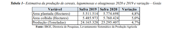 O IBGE divulgou nesta terça-feira, 9, a Pesquisa Levantamento Sistemático da Produção Agrícola (LSPA) referente ao mês de maio de 2020. Segundo a pesquisa, a estimativa de maio para a safra de cereais, leguminosas e oleaginosas de 2020 em Goiás permanece recorde, impulsionada principalmente pela super-safra de soja.
