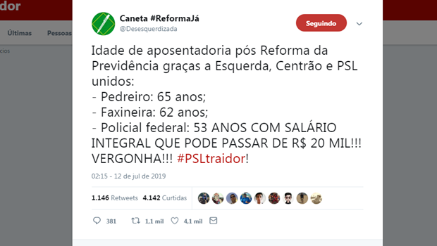 Uma das postagens usando a hashtag dizia : “Eleitor de direita sendo chamado de anta pela deputada que ele ajudou a eleger! Seria cômico se não fosse trágico!”, outra, afirmava: “Aposentadoria de policiais federais, rodoviários federais e afins: Reforma do Guedes: 55 anos para todos recebendo teto do INSS (R$ 5,8 mil) Reforma PSL-Centrão-Esquerda: MAMATA de aposentadoria aos 53 anos com *salário integral* (+ de R$ 20 mil) e paridade”.