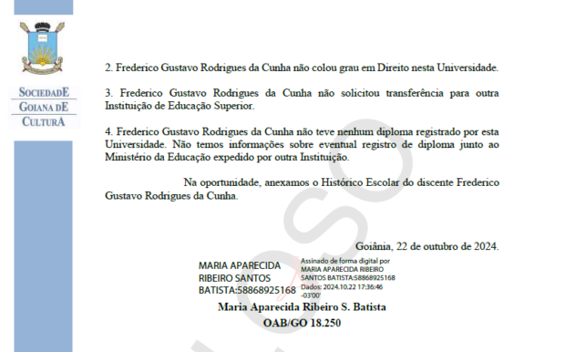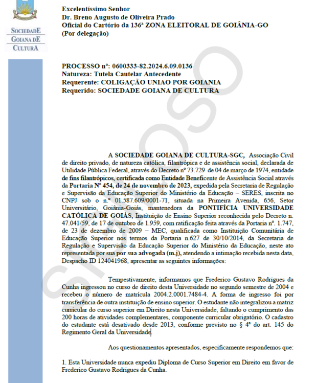 A Sociedade Goiana de Cultura (SGC), instituição que criou e mantém a Pontifícia Universidade Católica de Goiás (PUC Goiás), declarou que nunca expediu diploma de curso superior em Direito em favor de Fred Rodrigues (PL), candidato a prefeito de Goiânia. A declaração foi dada em resposta a ação movida pela Coligação União por Goiânia no Tribunal Superior Eleitoral (TSE). A reportagem entrou em contato com Fred Rodrigues, que não atendeu às ligações e mensagens. O Jornal Opção também entrou em contato com a assessoria do candidato. O espaço permanece aberto.