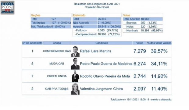 Foi registrado que 6583 advogados aptos a votar deixaram de comparecer, o que configurou uma abstenção de 25,77%. Os votos brancos e nulos somaram pouco mais de 3%.