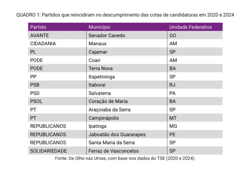 Algumas legendas, como UP, PCB, PCO e PSTU, cumpriram integralmente a legislação. Outras, no entanto, retrocederam. O partido Novo, por exemplo, que em 2020 não havia registrado descumprimentos, violou a cota em 1% dos municípios em 2024.