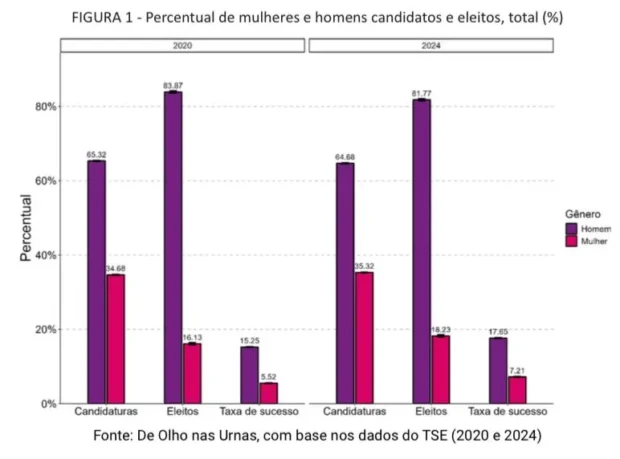 O relatório intitulado “Desigualdade de gênero nas eleições proporcionais de 2020 e 2024: fatores associados ao desempenho eleitoral das mulheres” aponta ainda que as mulheres representaram 34,6% das candidaturas a vereadora em 2020, percentual que subiu ligeiramente para 35,3% em 2024. No entanto, o sucesso eleitoral, embora tenha crescido, ainda permanece desigual: a taxa de mulheres eleitas passou de 5,5% para 7,2%, enquanto a dos homens saltou de 15,2% para 17,6%.