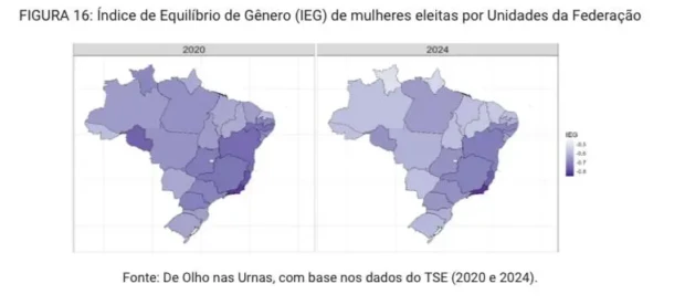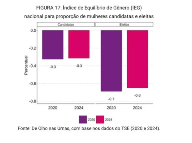Em 2024, o IEG para candidaturas manteve-se em -0,3, o mesmo nível de 2020. Entre as eleitas, houve apenas pequena melhora, passando de -0,7 para -0,6. O Rio de Janeiro teve os piores resultados, com -0,35 entre as candidatas e -0,82 entre as eleitas. Já o Amazonas obteve os melhores índices, mas ainda negativos, com -0,21 entre as candidatas.