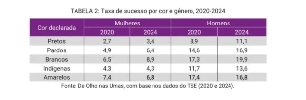 A pesquisa também avaliou o impacto da raça sobre o desempenho eleitoral. Em 2024, mulheres brancas alcançaram taxa de sucesso de 8,9%, bem acima das pretas (3,4%) e das pardas (6,4%). Embora as mulheres pretas tenham apresentado leve avanço em relação a 2020, passando de 2,7% para 3,4%, a melhora ainda é insuficiente para alterar o quadro de sub-representação.