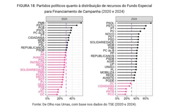 No entanto, o cenário geral mostra evolução positiva. A fatia dos recursos do Fundo Partidário destinada às mulheres passou de 28,9% em 2020 para 42,5% em 2024. Já no caso do FEFC, o salto foi de 29,6% para 43,9%.