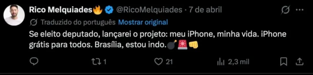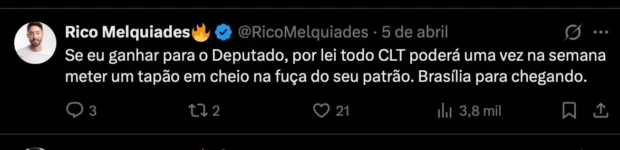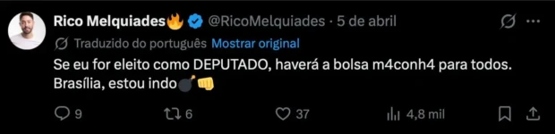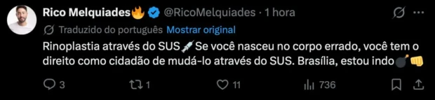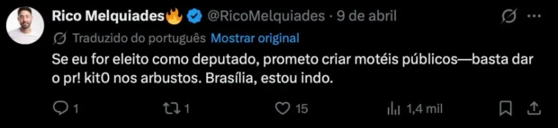 O influenciador Rico Melquíades, pré-candidato a deputado pelo PSDB, sigla à qual se filiou há 12 dias, tem feito anúncios de promessas de campanha que chamaram atenção na internet. Entre elas estão rinoplastias pelo SUS, motéis públicos e subsídio para a compra de cannabis.
