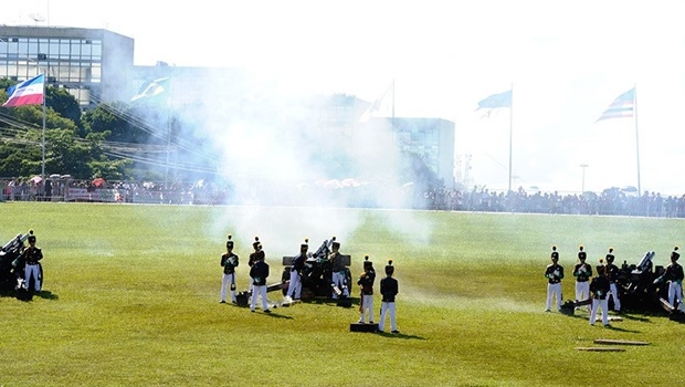 Encerrada a sessão, o presidente da República, já empossado, desce a rampa do Palácio do Congresso Nacional e, como comandante-chefe das Forças Armadas, passará em revista as tropas da Marinha, do Exército e da Aeronáutica, sendo ainda homenageado com uma salva de 21 tiros de canhão.