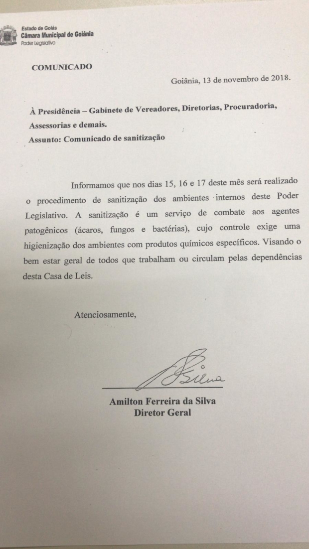 Conforme foi enviado ao Jornal Opção, o documento diz que a Câmara passará pelo “processo de sanitização dos ambientes internos do poder Legislativo nos dias 15, 16 e 17” e explica que a limpeza “é um serviço de combate aos agentes patogênicos (ácaros, fungos e bactérias)”. Confira o documento: