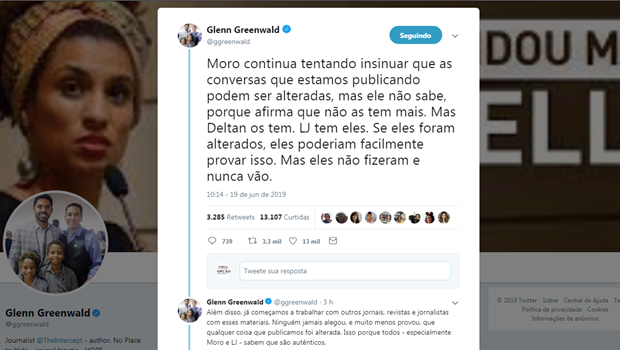 O fundador do site de notícias The Intercept Brasil, jornalista Glenn Greenwald, escreveu uma publicação em sua conta no Twitter, na qual rebate pontos do depoimento do ministro da Justiça e Segurança Pública, Sérgio Moro, na Comissão de Constituição e Justiça (CCJ) do Senado.