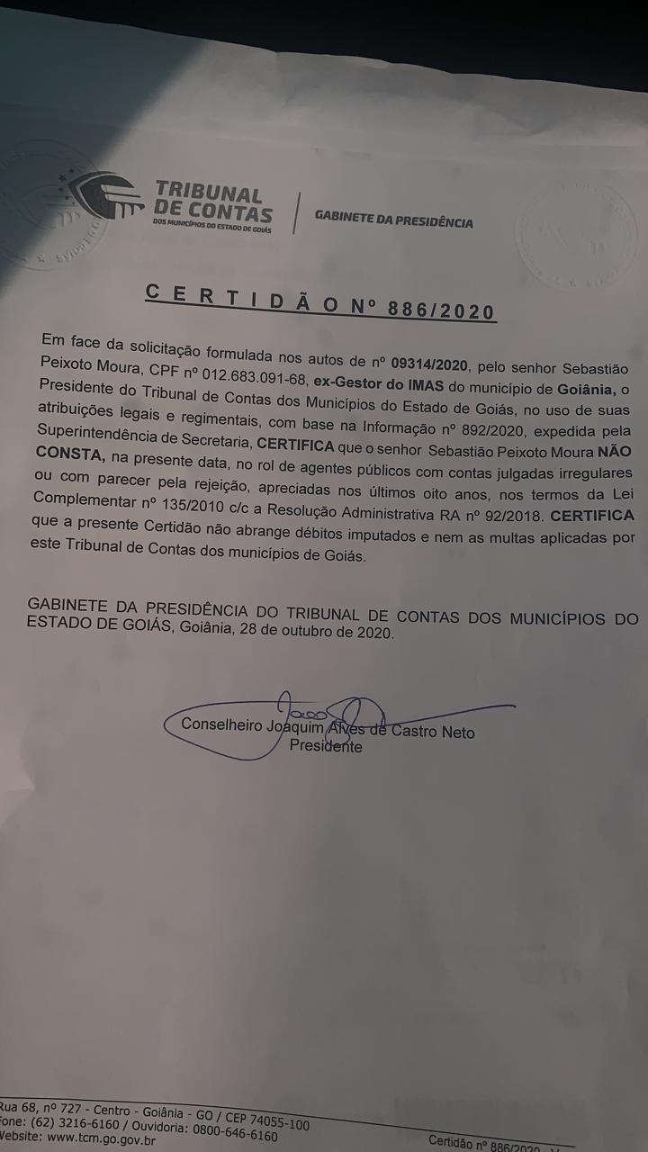 Segundo o vereador Wellington Peixoto (DEM), a certidão negativa, assinada pelo presidente do Tribunal de Contas do Município, Joaquim Alves de Castro Neto, atesta que não há ilegalidades na gestão de Sebastião Peixoto.