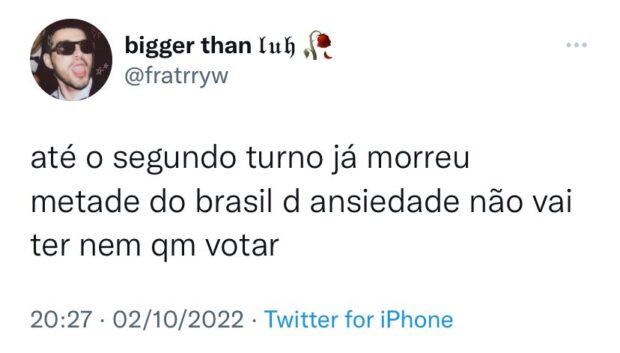 Outro usuário disse que pode até “morrer de ansiedade”, comenta: “Até o segundo turno já morreu metade do Brasil de ansiedade, não vai ter nem quem votar”.