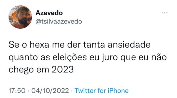 Um internauta comentou em tom de brincadeira: “Se o hexa me der tanta ansiedade quanto as eleições eu juro que não chego em 2023”.