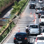 O fotografo do Jornal Opção, Fernando Leite, flagrou, na manhã desta segunda-feira (5/6), os motoristas tendo que se espremer e se arriscar para conseguir passar pelo trecho interditado. A sinalização do local foi feita pela Secretaria Municipal de Trânsito, Transporte e Mobilidade (SMT).