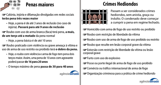 Vale lembrar que a Câmara dos Deputados rejeitou alguns itens da proposta original. Dentre eles, o “excludente de ilicitude”. A mexida isentaria de punição policiais que viessem a matar “sob medo, surpresa ou violenta emoção”. Também foram suprimidas a possibilidade de audiências com presos por videoconferência. (Com informações da Agência Senado)