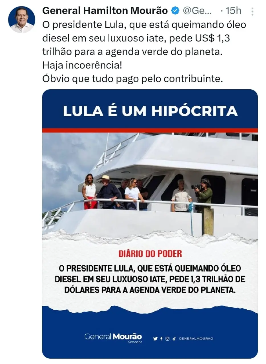 Em publicação realizada na rede social X, Mourão afirmou que “O presidente Lula, que está queimando óleo diesel em seu luxuoso iate, pede US$ 1,3 trilhão para a agenda verde do planeta. Haja incoerência! Óbvio que tudo pago pelo contribuinte.” A crítica ocorre justamente no momento em que o governo federal tenta reforçar a imagem do país como referência em sustentabilidade global.
