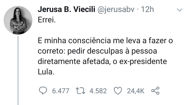 Após vazamentos de novos diálogos entre integrantes da força-tarefa da Operação Lava Jato, pelo UOL em parceria com o site The Intercept Brasil, a procuradora Jerusa Viecili usou as redes sociais para pedir desculpas ao ex-presidente Lula. Com essa atitude, ela confirma a autenticidade dos diálogos em que integrantes da Lava Jato ironizaram a morte da esposa de Lula, Marisa Letícia, e os pedidos do ex-presidente para ir aos enterros de familiares que morreram.