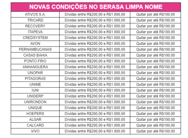 Paraticipam da iniciativa: Tricard, Recovery, Ativos, Itapeva, Credsystem, Avon, Pernambucanas, Casas Bahia, Ponto Frio, Anhanguera, Unopar, Pitagoras, Unime, Iuni, Uniderp, Unirondon, Unique, Hoepers, Algar, Calcard e Vivo. Veja as condições abaixo: