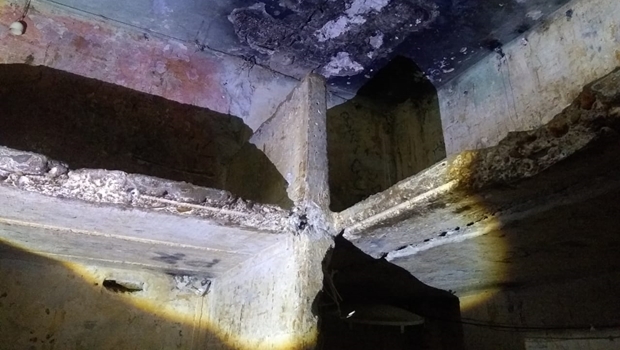 Um buraco feito na laje de uma das celas foi produzido por detentos que cumprem pena por roubo, furto, tráfico de entorpecentes, ameaça e receptação