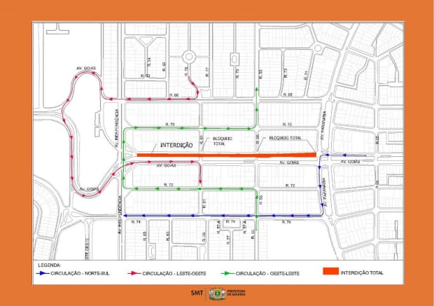 A via será interditada a partir de 8h e deve ficar 45 dias sem permissão para tráfego. Motoristas que descem a Avenida Goiás da Praça Cívica deverão desviar para a Rua 74 até a Avenida Independência ou para a Avenida Oeste, se quiser chegar à Goiás Norte.