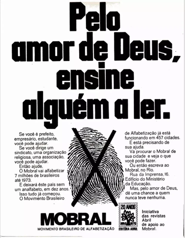 Graças ao MOBRAL estamos salvos! Sem ele a classe dominante estaria talvez perdida. Imagine-se o ano 2.000, sem analfabetos no Brasil! Seria um absurdo! Não, graças à previdência de criar para alfabetizar um órgão que não alfabetiza, de não gastar os escassos recursos destinados à educação onde se deveria gastar, de não investir onde se deveria investir – se o propósito fosse generalizar a educação primária – podemos contar com a garantia plena de que manteremos crescente o número absoluto de analfabetos de nosso país.