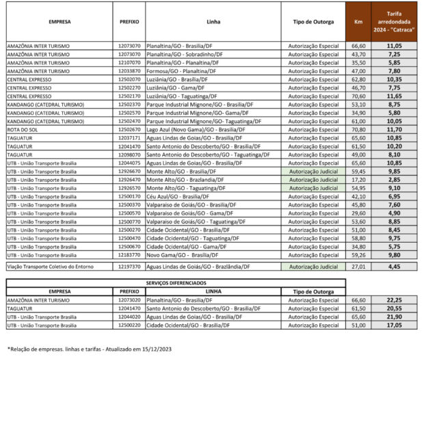 A Agência Nacional de Trânsito Terrestre (ANTT) anunciou, nesta sexta-feira, 23, o reajuste da tarifa do transporte semiurbano entre o Distrito Federal e o Entorno de Brasília. De acordo com a nova tabela de tarifa, o valor pode chegar, a depender do trecho, a R$ 11,70. O aumento médio de 8,56% começa a valer neste domingo, 25, e foi justificada pela “não recomposição devida” em anos anteriores. Clique aqui para ver os valores para todas as linhas.