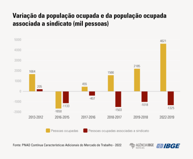 “A redução na população sindicalizada acentuou-se a partir de 2016, quando a queda da sindicalização foi acompanhada pela retração da população ocupada total. A partir de 2017, embora com a população ocupada crescente, o número de trabalhadores sindicalizados permaneceu em queda”, analisa Adriana Beringuy, coordenadora de pesquisas por amostra de domicílios do IBGE.