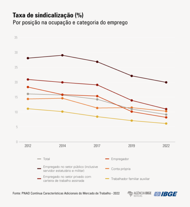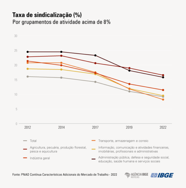 Além disso, houve uma redução na taxa de sindicalização em todos os grupos de atividades econômicas, exceto nos Serviços Domésticos, que mantiveram uma taxa de 2,8% em 2019 e aumentaram 0,1 ponto percentual em relação a 2012 (2,7%). O setor que experimentou a maior queda na taxa de sindicalização ao longo de 11 anos foi o de Transporte, Armazenagem e Correios, de 20,7% em 2012 para 11,8% em 2019 e 8,2% em 2022.
