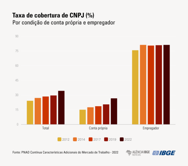 Em 2022, dentre os 30,2 milhões de empregadores e trabalhadores por conta própria, um total de 10,3 milhões, 34,2%, estavam envolvidos em empreendimentos registrados no Cadastro Nacional da Pessoa Jurídica (CNPJ), um crescimento em relação a 2019, quando esse número era de 29,3%.