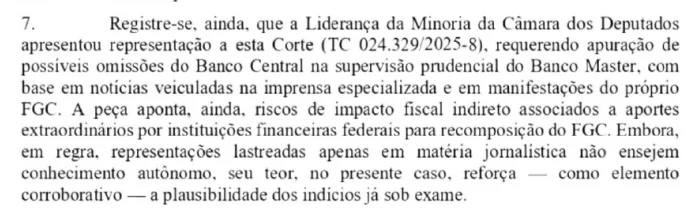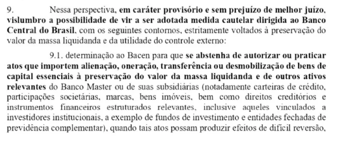 Também é mencionada uma proposta de aquisição do Banco Master por um grupo privado, formalizada às vésperas da liquidação, com previsão de aporte de cerca de R$ 3 bilhões. Segundo o TCU, a proximidade temporal entre essa iniciativa e a decisão regulatória, em meio a fatos supervenientes de natureza criminal envolvendo dirigente da instituição, reforça a necessidade de esclarecimentos sobre a cronologia do processo.