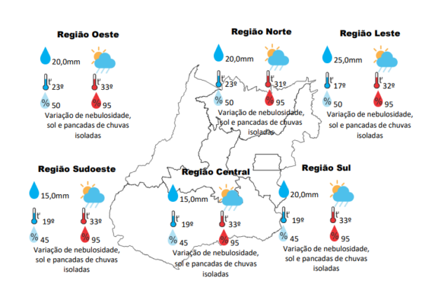 Segundo previsão do Centro de Informações Meteorológicas e Hidrológicas de Goiás (Cimehgo), a semana em Goiás será de temperaturas amenas pela manhã, com aumento dos termômetros ao longo do dia.
