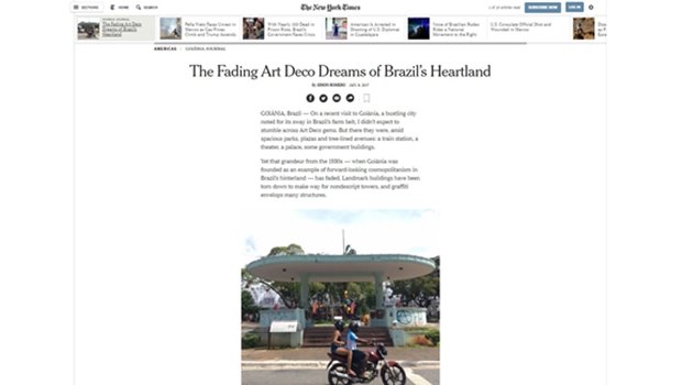 Na matéria entitulada “The Fading Art Deco Dreams of Brazil’s Heartland” (Os decadentes sonhos da Art Déco do coração do Brasil, em tradução livre), o jornalista relata suas impressões durante visita à capital e se diz surpreso ao encontrar “joias” da Art Déco, ao mesmo tempo em que lamenta a destruição da paisagem por pichações e o boom imobiliário.