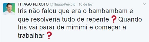 Thiago Peixoto: “Quando Iris vai parar de ‘mimimi’ e começar a trabalhar?”