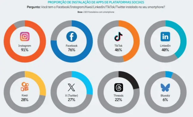Segundo o levantamento, o Facebook está instalado em 76% dos smartphones brasileiros e o X é encontrado em 27% dos aparelhos, o que representa queda em relação a pesquisa anterior onde os aplicativos apresentavam 82% e 33% respectivamente.