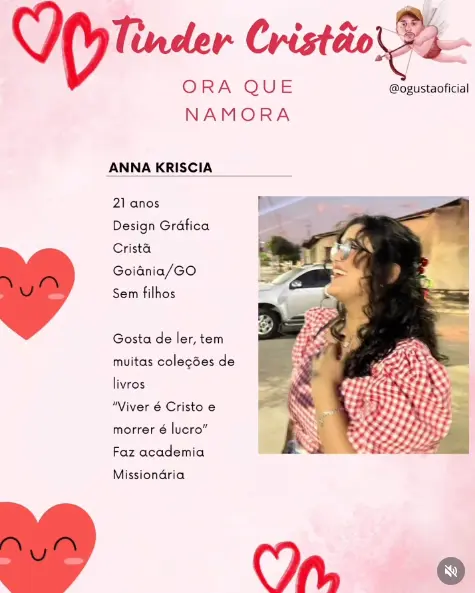 Outra participante é Anna Kriscia, de 21 anos, residente em Goiânia. Na apresentação, ela afirma ser design gráfica, cristã e não tem filhos. “Gosta de ler, tem muitas coleções de livros. Faz academia e é missionária”, publicou.