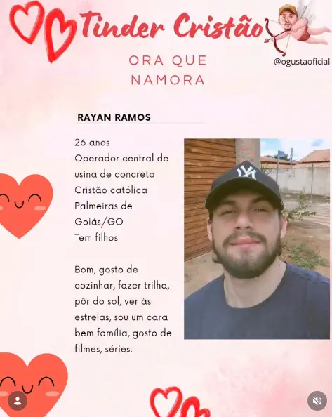 Entre os homens, Rayan Ramos, de 26 anos, morador de Palmeiras de Goiás, também integra a lista. Ocupador central de usina de concreto, ele é católico e afirma ter filhos. “Gosto de cozinhar, fazer trilha, pôr do sol, ver as estrelas. Sou um cara bem família, gosto de filmes e séries”, relatou.