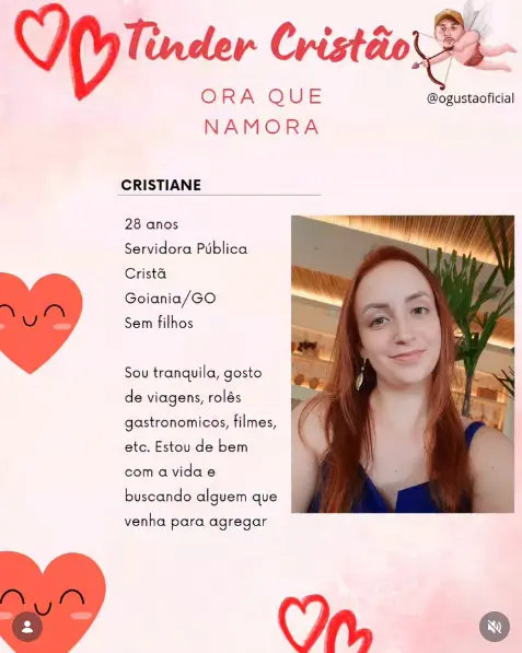 Cristiane, de 28 anos, moradora de Goiânia. Servidora pública, cristã e sem filhos, ela se descreve como uma pessoa tranquila, que gosta de viagens, passeios gastronômicos e filmes. “Estou de bem com a vida e buscando alguém que venha para agregar”, afirma na apresentação.