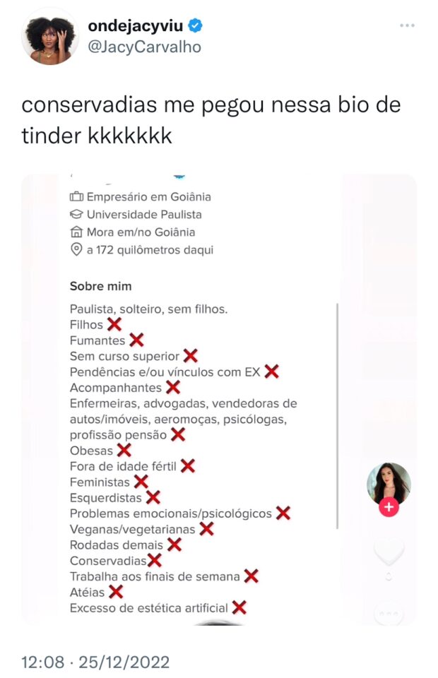 Um empresário de Goiânia viralizou nas redes sociais após divulgar requisitos um tanto “questionáveis” pelos internautas. As exigências, são feitas pelo homem através do Tinder, um dos maiores aplicativos de paquera do mundo.