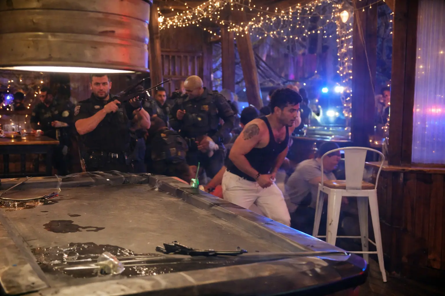 A área ao redor do bar atingido foi isolada para perícia e coleta de provas.