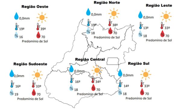 Clima seco e altas temperaturas. Esse é o prognóstico para todas as regiões do Estado de Goiás, aponta o boletim do Centro de Informações Meteorológicas e Hidrológicas do Estado de Goiás (Cimehgo) para esta sexta-feira, 4. Em Goiânia, a temperatura máxima pode chegar a 32ºC e a umidade relativa do ar pode variar entre 18% e 70%.