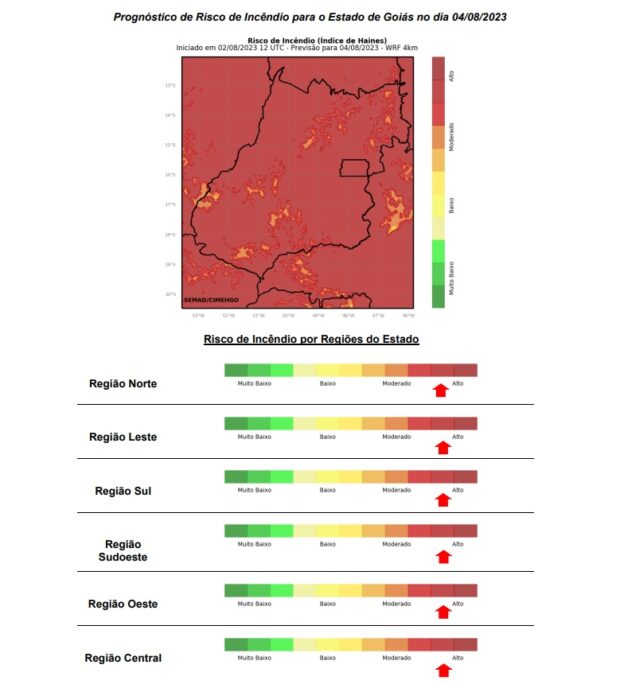O boletim aponta ainda um alto risco de incêndio em praticamente todas as regiões. Confira abaixo: