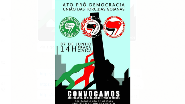 A exemplo do protesto realizado em São Paulo no domingo, 31, as três principais torcidas organizadas do Atlético, Goiás e Vila Nova convocaram para Ato Pró Democracia — União das Torcidas, a ser realizado no próximo domingo, 7, às 14 h na Praça Cívica, em Goiânia.
