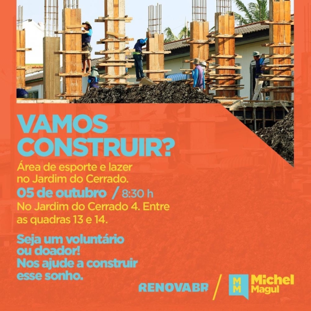 Neste sábado, 5, será realizado trabalho voluntário no Jardim Cerrado IV, entre as quadras 13 e 14. A ação visa construir, em área pública, um campo de futebol e uma quadra de vôlei de areia. Além disso, serão plantadas árvores e realizada instalação de bancos para criar um local de convivência. Michel Magul, o realizador da ação social, aceita doações por meio do site https://bit.ly/30MWdcK, bem como apoio de voluntários na data da ação, às 8:30h.
