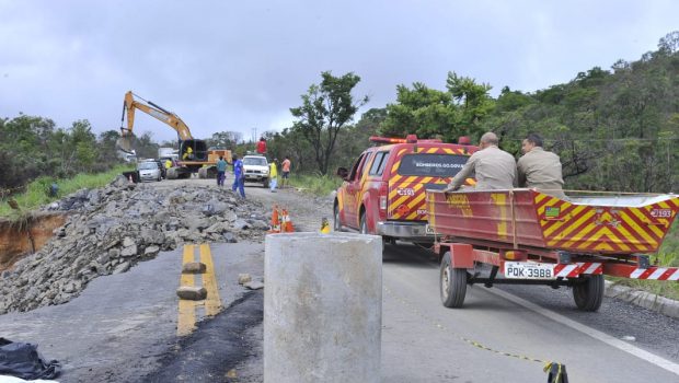 As obras executadas são para reforço do talude, com colocação de pedras no leito da via. Mais de 20 caminhões e carretas trabalham na locomoção do material. O governo destinou R$ 80 milhões para ações emergenciais nas rodovias estaduais do Norte e Nordeste goiano.