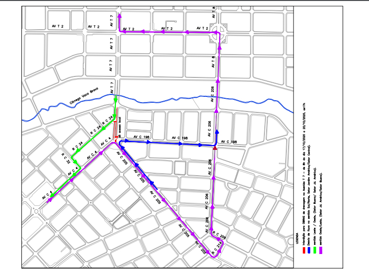 Já que passa pela Avenida C-4 no sentido Vila dos Alpes / Setores Bueno e Oeste serão desviados para a Avenida C-205, Rua C-214, Avenida 206, Avenida T-8, Avenida T-2, até retomar a circulação normal pela Avenida T-7.