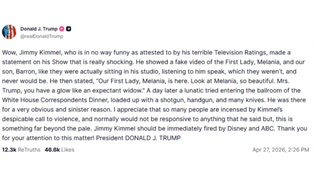 Um dia depois, um atirador realizou um ataque em um jantar em que Trump estava presente, o presidente associou o atentado às piadas de Jimmy Kimmel e delcarou “Ele estava lá por um motivo muito óbvio e sinistro. Compreendo que tantas pessoas estejam indignadas com o desprezível incitamento à violência de Kimmel e, normalmente, não daria atenção a nada do que ele dissesse, mas isso é algo que ultrapassa completamente os limites”.