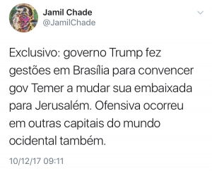O presidente dos Estados Unidos, Donald Trump, tentou convencer o governo de Michel Temer (PMDB) a mudar a embaixada do Brasil em Israel para Jerusalém, segundo publicação no Twitter do jornalista do “Estadão”, Jamil Chade.