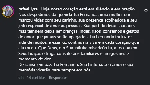 “Que triste, conhecemos a tia Fernanda e ela foi tão receptiva e amorosa, Deus conforte o coração de todos da família”, afirmou um morador do município.