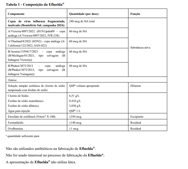 Além disso, a bula da vacina garante que a “Efluelda® é uma suspensão aquosa estéril de vírus influenza inativado para injeção intramuscular”, além de conter “quatro cepas de vírus influenza propagados em ovos de galinha embrionados.” A bula ainda informa outros componentes ativos, confira: