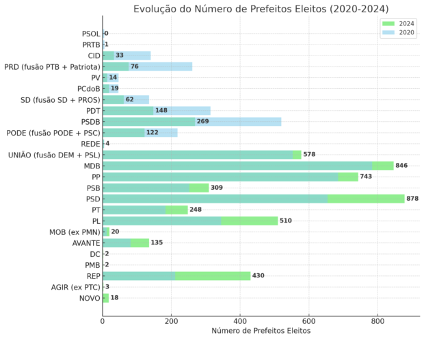 Outro partido que se destacou foi o Partido Liberal (PL), que elegeu 510 prefeitos em 2024, comparado a 345 em 2020, resultando em um aumento de 47,83%. O Partido dos Trabalhadores (PT) também teve um desempenho positivo, elegendo 248 prefeitos, um crescimento de 35,52% em relação a 2020.