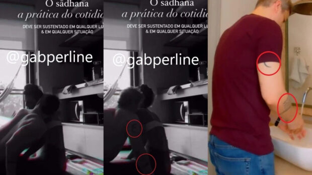 possível ver um homem sem camiseta, apenas de calça, dando um beijo carinhoso no pescoço da instrutora de ioga. O homem em questão é Lucas Lima. E as provas são as tatuagens que aparecem no braço do rapaz, que são exatamente as mesmas do ex-marido de Sandy. Veja: